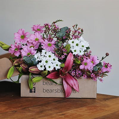 In the box you’ll find pink Asiatic lilies, pink and white chrysanthemums, fragrant waxflower, and baby blue eucalyptus.