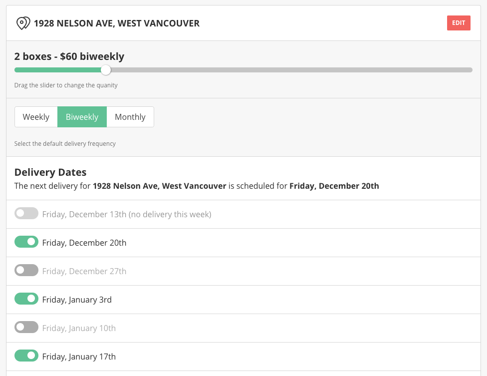 Due to popular demand we have introduced default delivery frequencies. You can now set your default delivery frequency to either weekly, biweekly or monthly and it's super easy! Just login, navigate to the manage deliveries page and select your preferred default delivery frequency from the options provided (see image below) - and that's it!